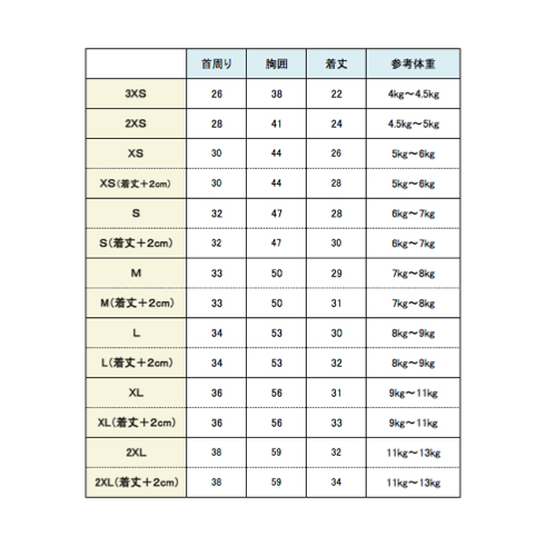 A 首周り・B 胸囲・C 着丈の3サイズを測り、その子にあったサイズを選んでください。